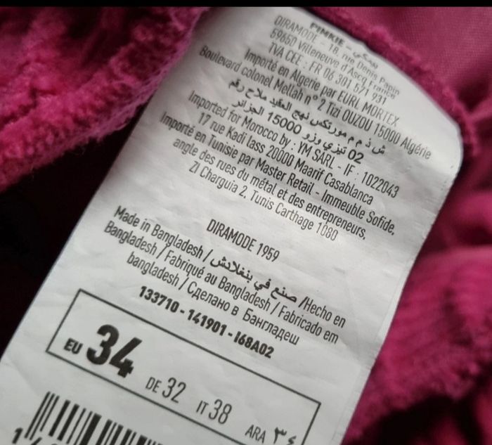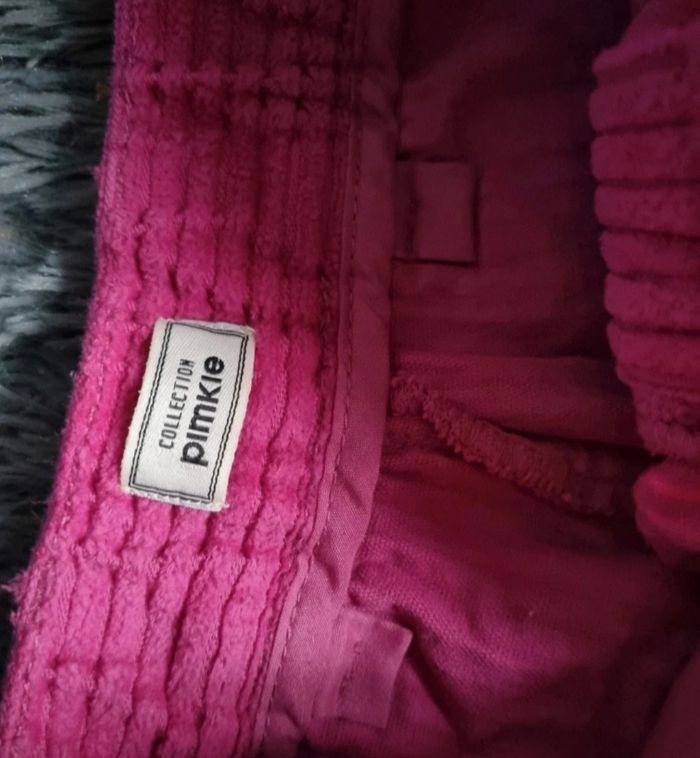 Pantalon fuchsia velours côtelé, taille 34 marque Pimkie, longueur 100cm, largeur de la taille 34cm, largeur cuisse 27cm, largeur cheville 23cm,longueur de la taille à l'entre jambes 32cm.