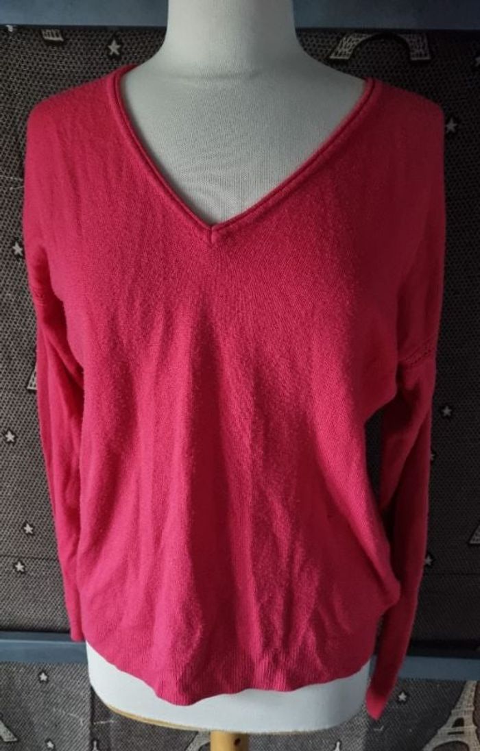 Pull rose à col V ,taille L marque Gémo, longueur 61cm, largeur 50cm, longueur épaule à aisselle 19cm, largeur aisselle à aisselle 54cm, longueur manche 51cm,léger acro voir dernière photo.