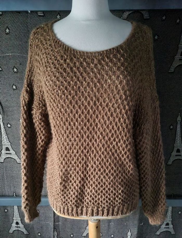 Pull ajouré couleur camel avec pailleté doré taille 40-42, longueur 61cm, largeur 47cm, longueur épaule à aisselle 22cm, largeur aisselle à aisselle 53cm, longueur manche 47cm.