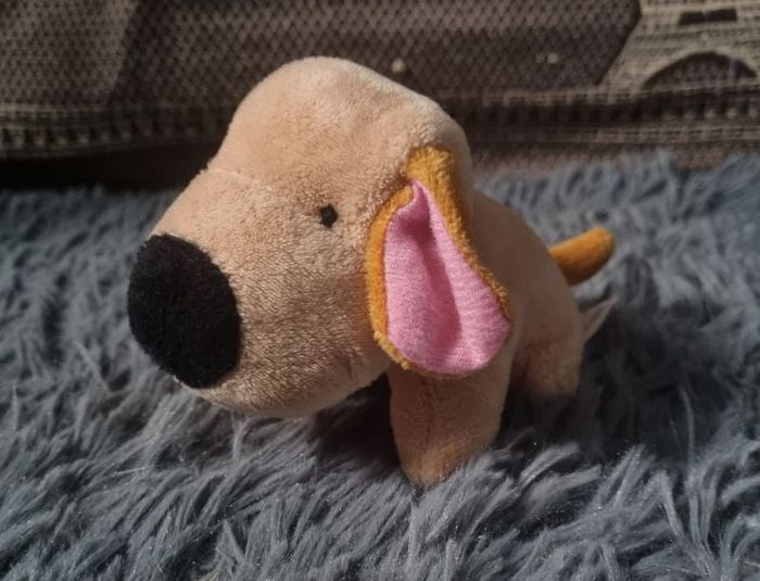 Petite peluche chien assis style doug chien de la haut, (mesures approximative) hauteur 10cm, longueur 11cm, largeur 8cm.