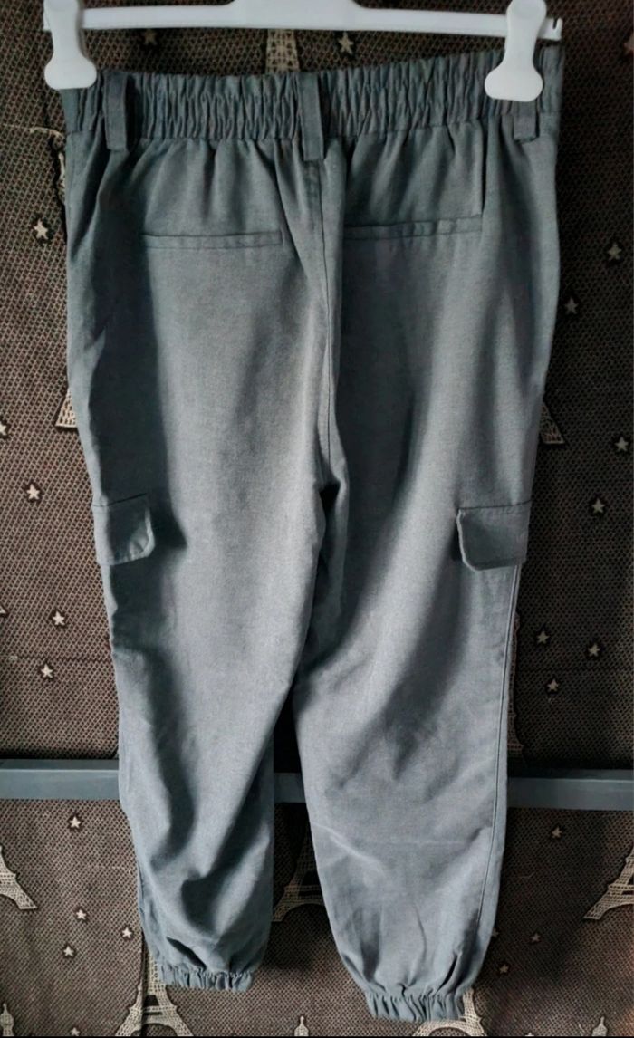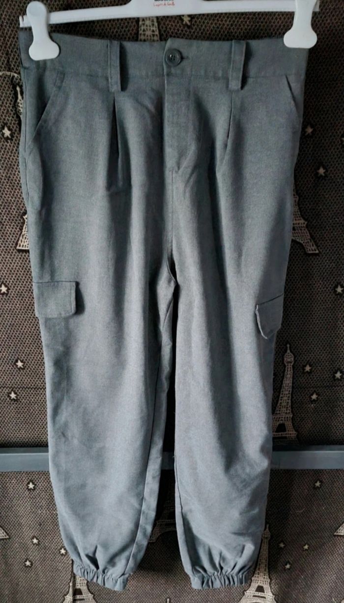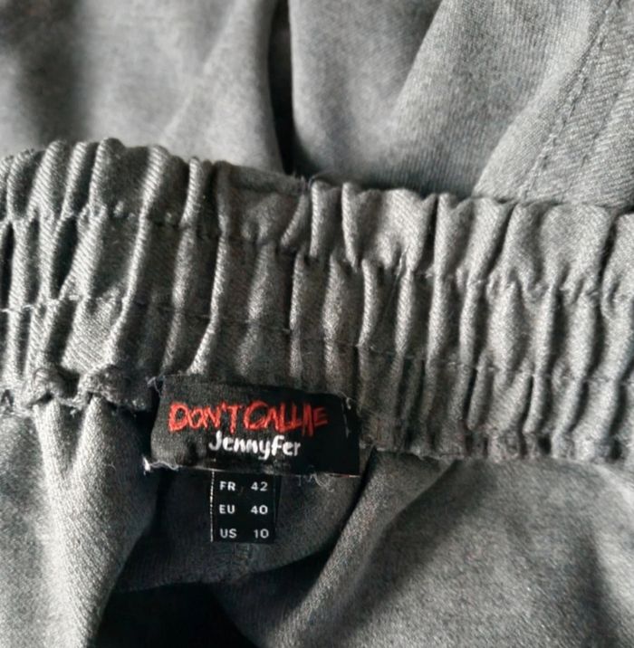 Pantalon style cargo gris, taille 42 marque Jennyfer, 2 vrais poches et 4 fausse poches,fermeture zippée avec bouton,élastique à la taille et aux chevilles, longueur 99cm, largeur de la taille 39cm jusqu'à 42cm, largeur cuisse 32cm, largeur cheville 13cm jusqu'à 16cm, J'offre avec une ceinture.