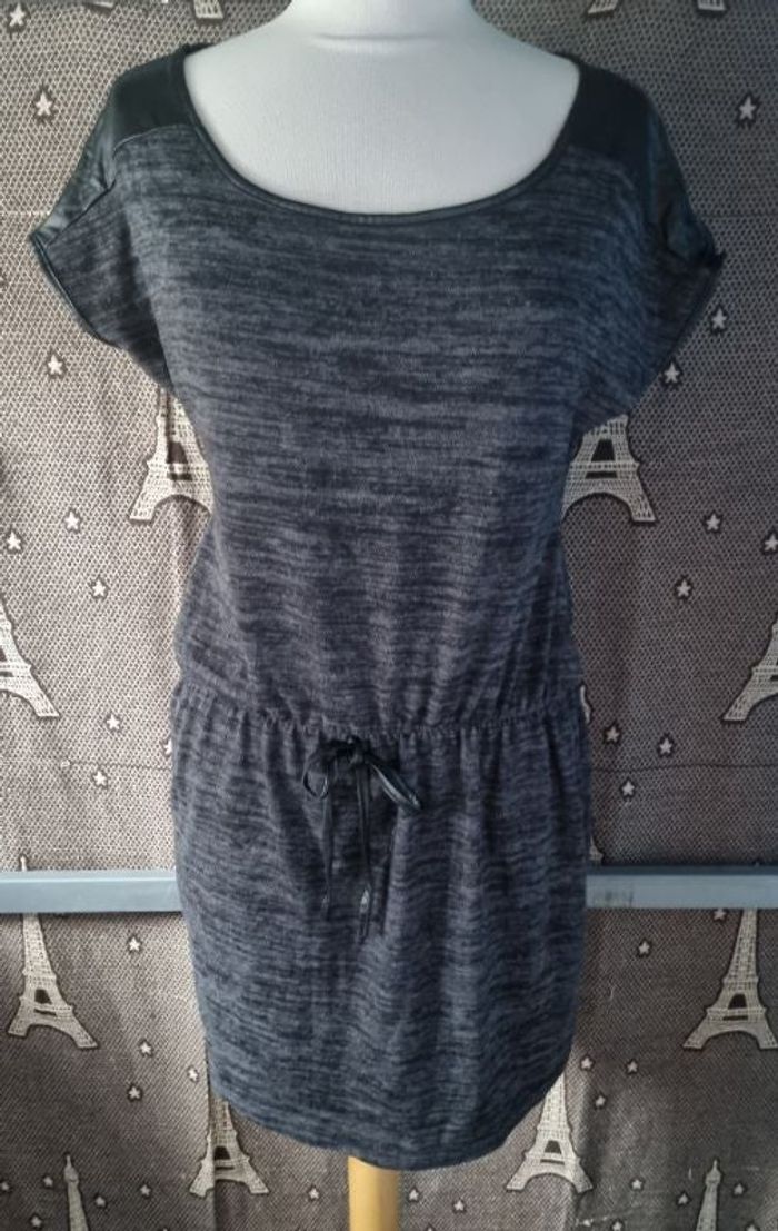 Robe grise à manches courtes avec effet style cuir sur épaules et bordure, faux cordon, élastique à la taille, marque Miss Glammy taille M, longueur 82cm, largeur 32cm jusqu'à 42cm, longueur épaule à aisselle 16cm, largeur aisselle à aisselle 56cm.