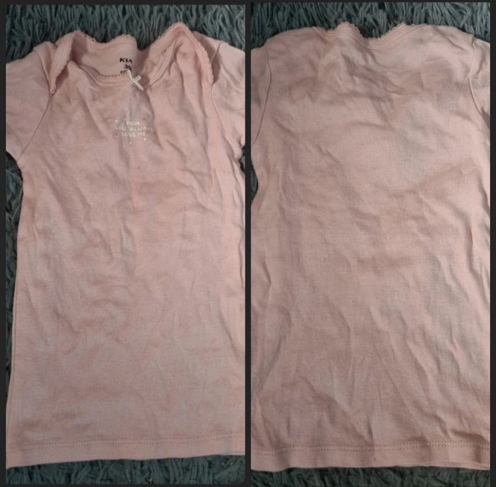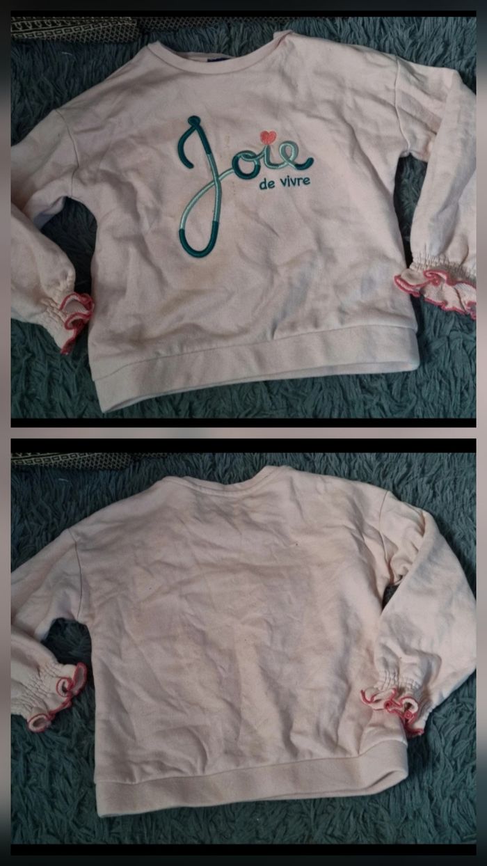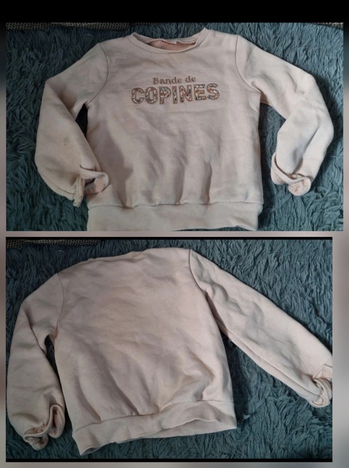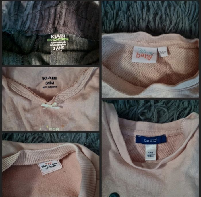 Lot 5 articles 3-4ans fille (défauts en photos): -un pantalon noir côtelé 3ans marque Kiabi recousu, -un sweat rose imprimé Tic&Tac 36mois marque Disney baby quelques légère taches, -T-shirt rose avec écriture 36mois marque Kiabi légère tache, -un sweat rose avec écriture fleuris 4ans marque Tape à l'œil quelques taches, -un sweat rose avec écriture 4ans marque Okaïdi, quelques taches.
