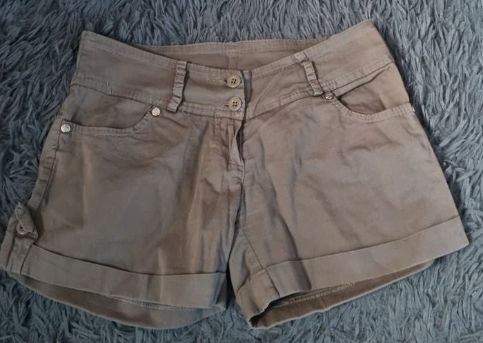 Short taille XS, poches avant et arrière, fermeture zippée avec boutons,longueur 26cm, largeur de la taille 37cm, largeur cuisse 22cm,légère tache voir dernière photo.