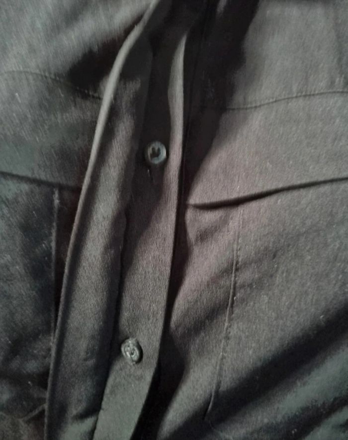 Chemisier noir sans manches,fermeture boutons, 2 poches, taille 40 marque La halle, longueur 72cm, largeur 45cm, longueur épaule à aisselle 20cm, largeur aisselle à aisselle 48cm.