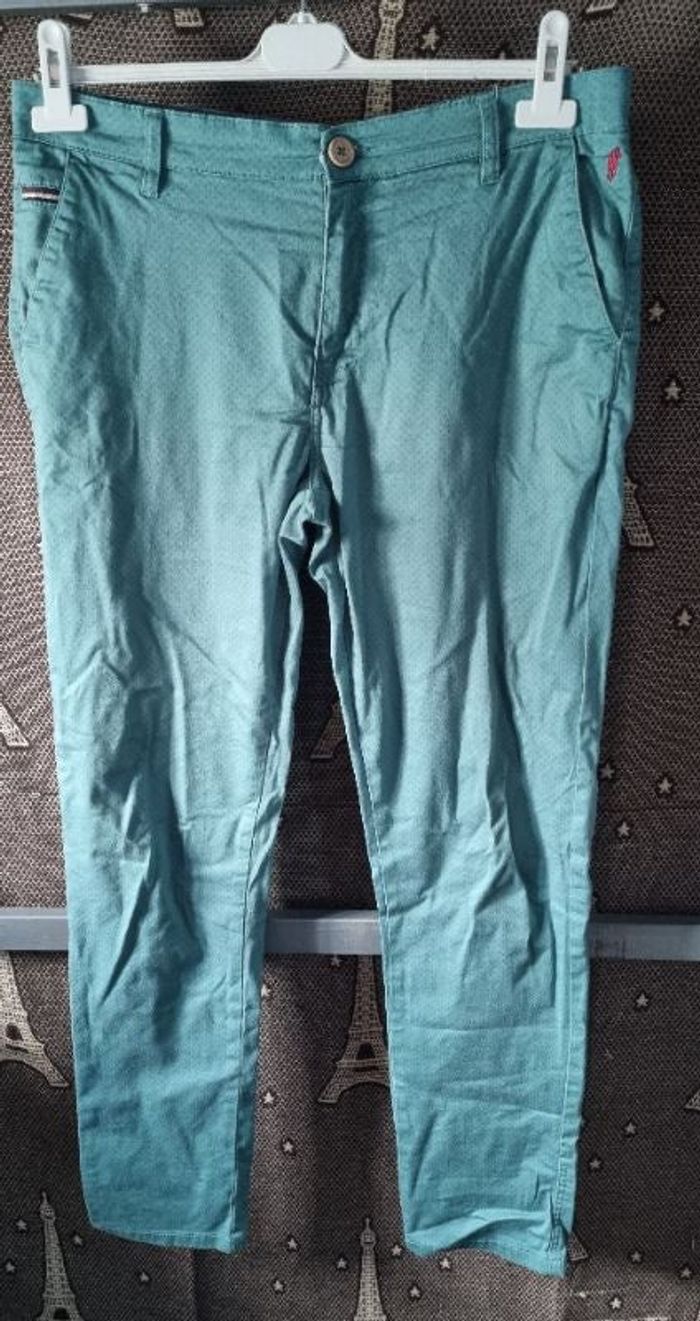 Pantalon chino vert à motifs, taille 44 marque Gentleman Farmer,fermeture zippée avec bouton, longueur 107cm, largeur de la taille 47cm, largeur cuisse 27cm, largeur cheville 15cm.