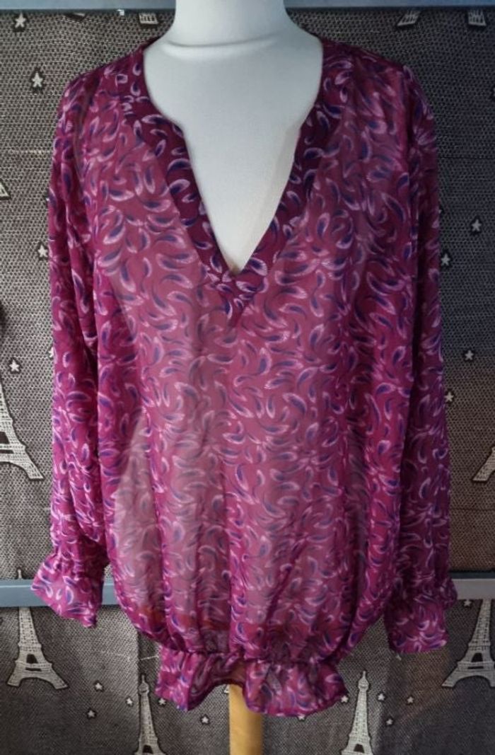 Blouse légère et transparente à motifs, manches longues, taille 54-56 marque Blanche Porte, longueur 75cm, largeur 61cm, longueur épaule à aisselle 25cm, largeur aisselle à aisselle 61cm, longueur manche 54cm.