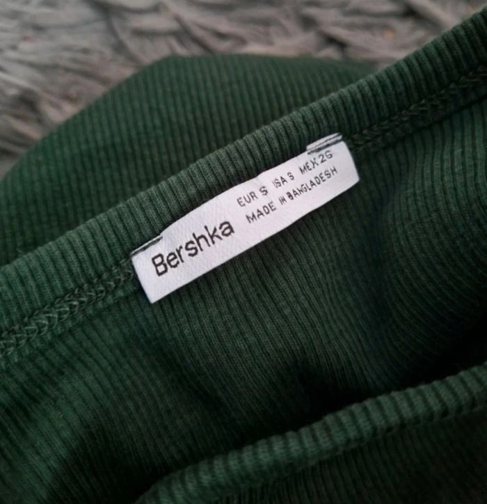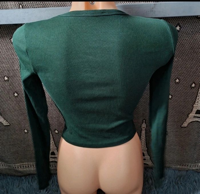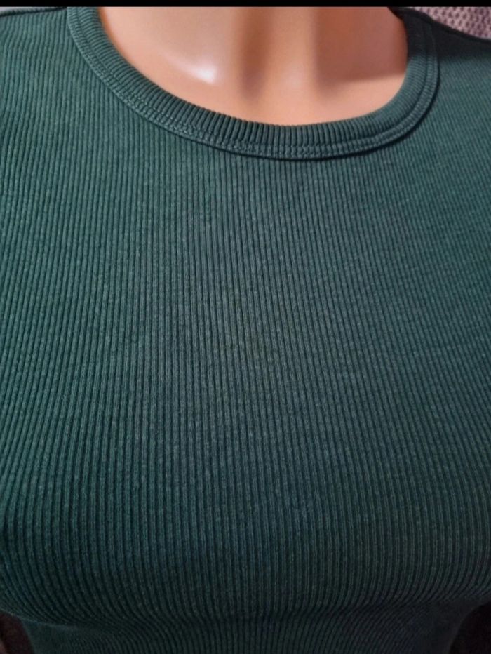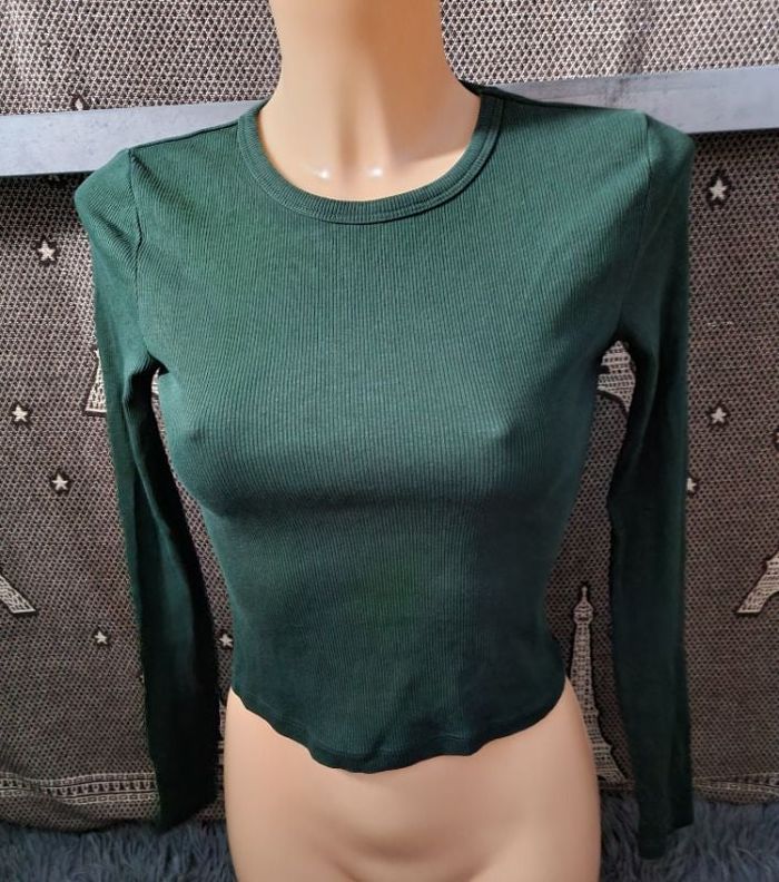 T-shirt à manches longues côtelé vert sapin, taille S marque Bershka, longueur 44cm, largeur 32cm, longueur épaule à aisselle 18cm, largeur aisselle à aisselle 37cm, longueur manche 46cm.