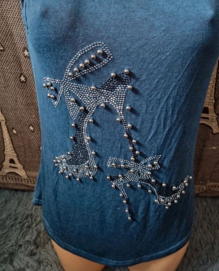 Débardeur bleu avec strass et perles forme chaussures, taille S marque Damod,longueur 57cm, largeur 43cm, longueur épaule à aisselle 21cm, largeur aisselle à aisselle 41cm.
