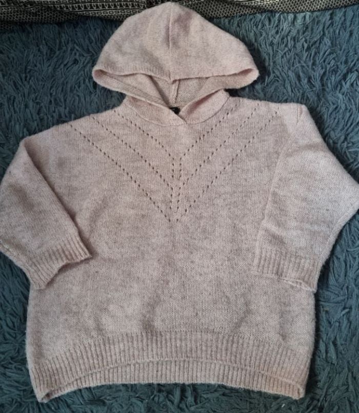Pull rose ajouré avec capuche, effet pelucheux ,taille 4ans marque Kiabi.