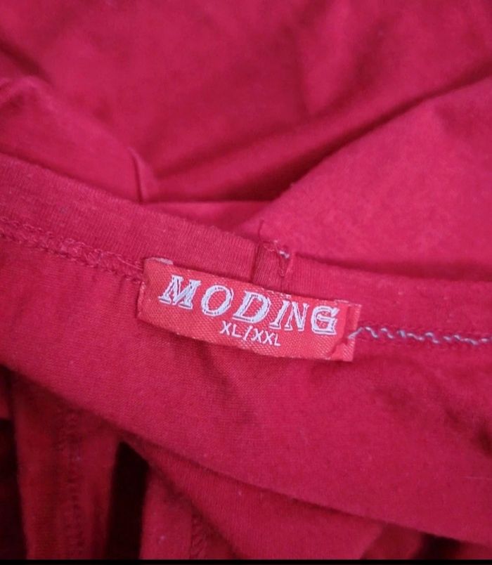 Débardeur rouge avec strass, taille XL-2XL marque Moding,longueur avec bretelles 68cm ,largeur 51cm, longueur épaule à aisselle 21cm, largeur aisselle à aisselle 55cm,tache voir dernière photo.