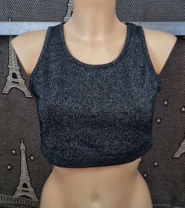 Top court pailleté, taille 38 marque Atmosphere, longueur 34cm,largeur 37cm, longueur épaule à aisselle 21cm, largeur aisselle à aisselle 41cm.