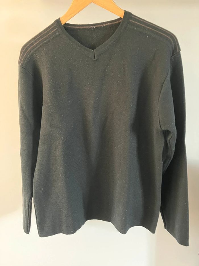 Pull noir avec des rayures marron discrètes aux épaules, col V, 50% acrylique 50% laine mérinos, taille supposée M État satisfaisant, aucune étiquette de marque et de taille