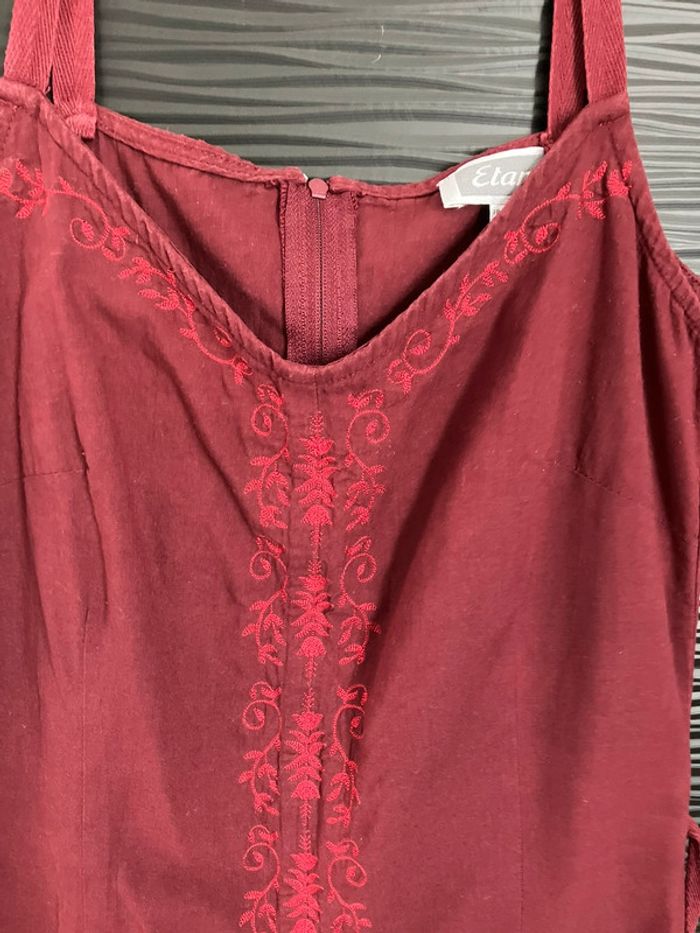 Robe cintrée et doublée en coton, bordeaux brodée d’arabesques et de fleurs en rouge, fermeture éclair et liens dans le dos, de marque Etam, taille 38 Très bon état
