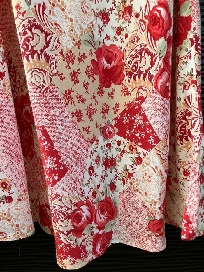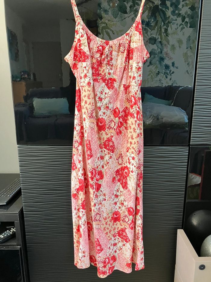 Robe cintrée rouge à motifs roses, à fines bretelles, 100% viscose, de marque Camaïeu, taille 38 (mais un petit 38) Très bon état (étiquette un peu effacée)