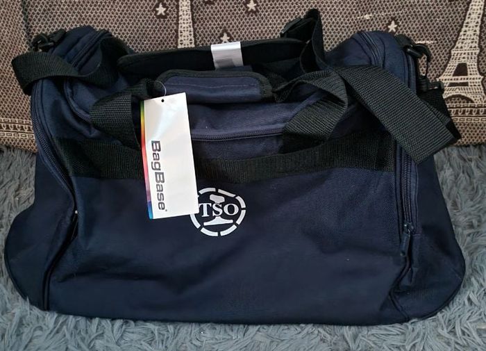 Sac de sport marine avec multiples rangements (grande pochette centrale avec une petite pochette intérieur + 2 pochettes sur les côtés),peut être porter sur l'épaule ou se tenir en mains,fermeture zippée, marque Bag Base,peut servir de sac de sport ou de voyage, longueur 54cm, largeur 25cm, hauteur 26cm.