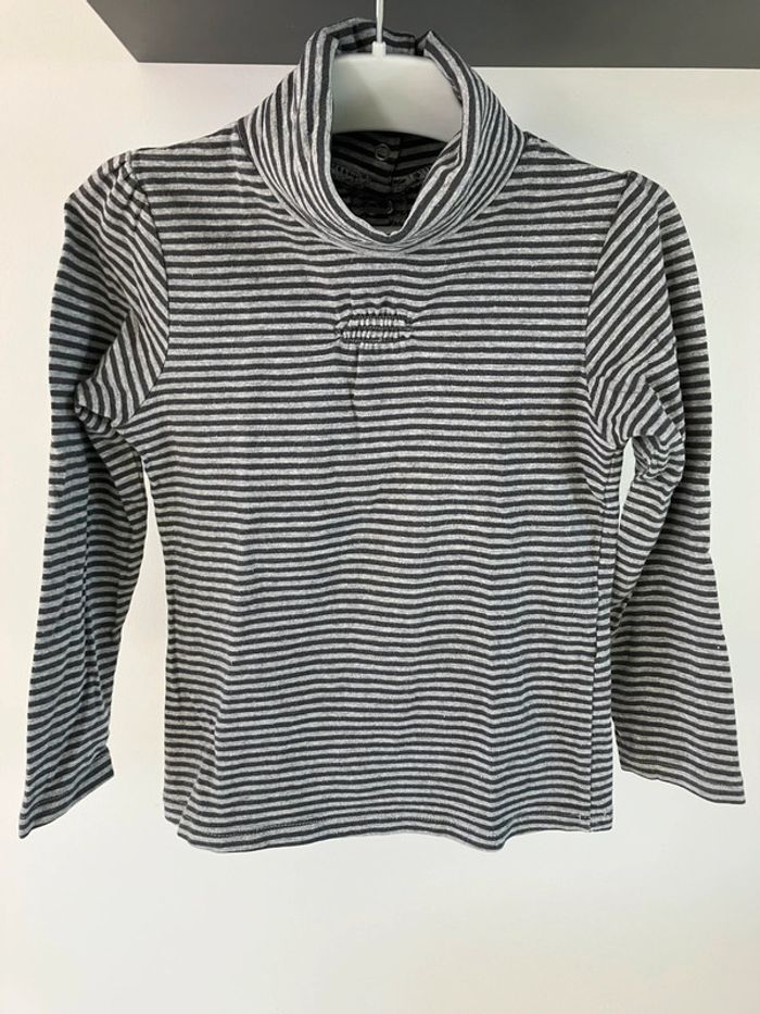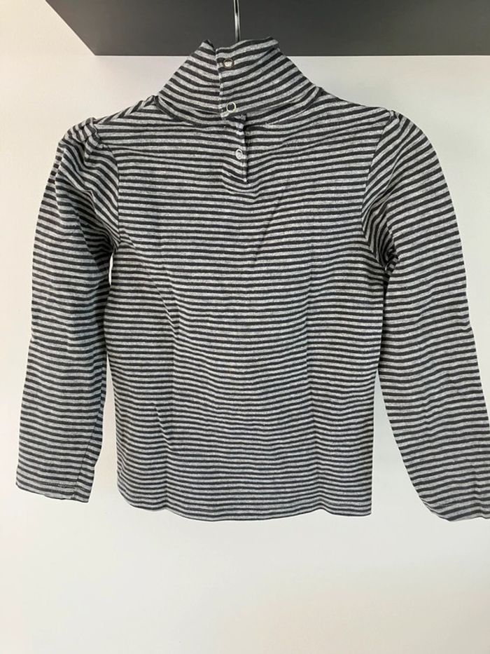 Pull à col roulé, rayé gris foncé sur gris clair, fermeture avec boutons pression à l’encolure, coton viscose elasthane, de marque Vertbaudet, 4 ans (102 cm) Très bon état
