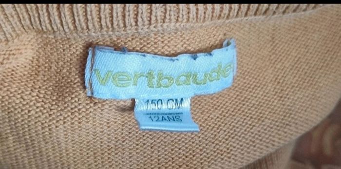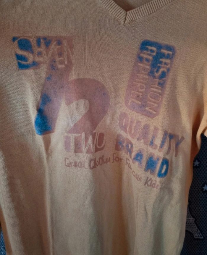 Pull moutarde avec écriture, taille 12ans marque Vertbaudet, la couleur ces effacé sur l'écriture du au lavage mais sinon le pull est en très bonne état.