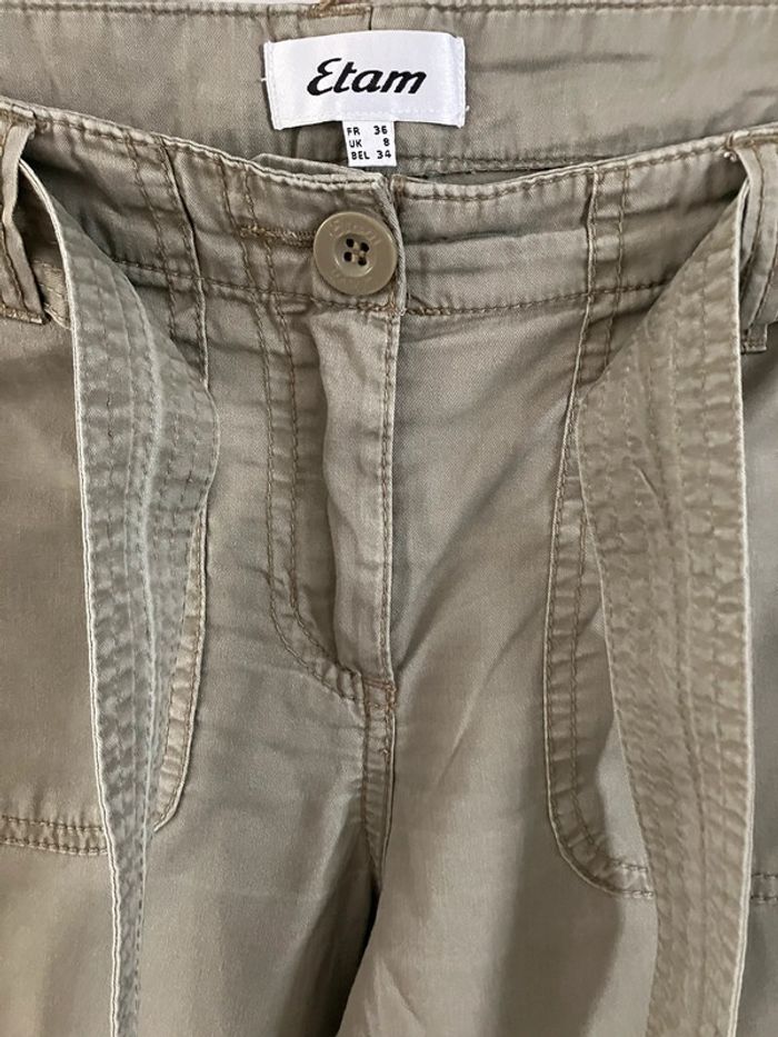 Pantacourt kaki, 2 poches devant avec bouton pression, 2 poches derrière avec fermeture éclair, 100% coton, de marque Etam, taille 36 Bon état