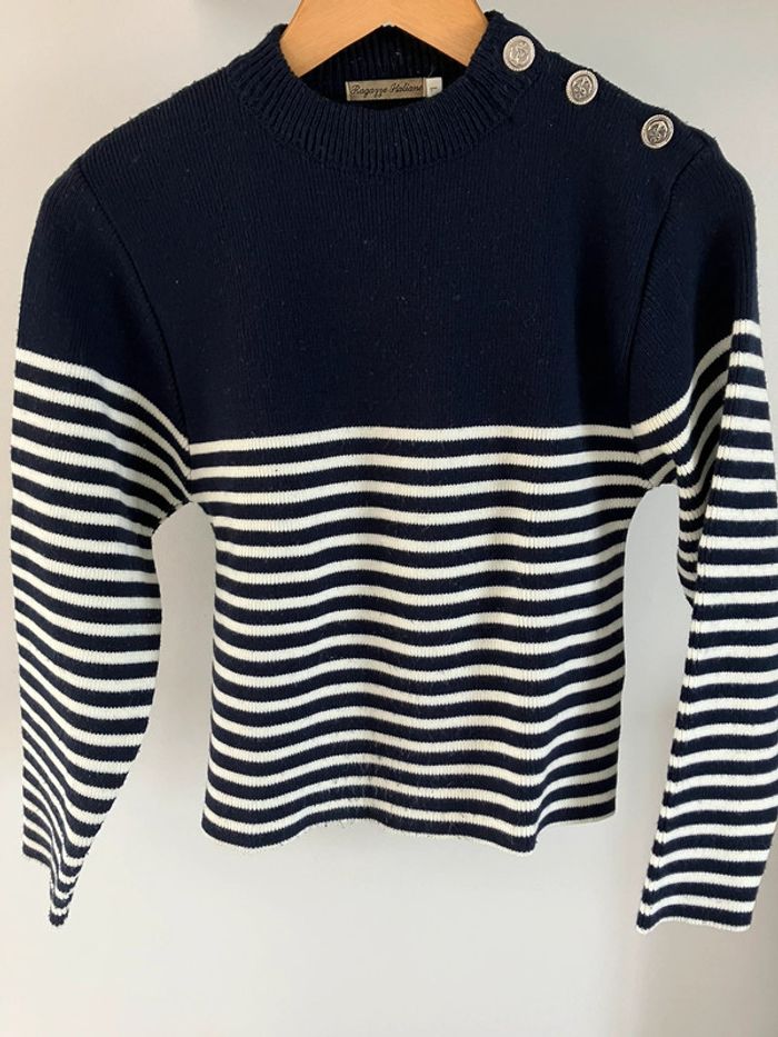 Pull bleu marine rayé blanc, avec trois vrais boutons à l’encolure à gauche, 90% coton 10% acrylique, de marque Ragazze Italiane, taille 1 État correct