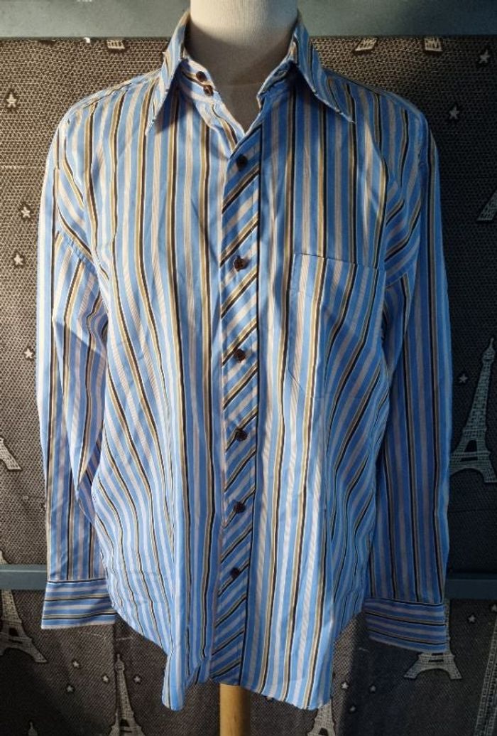 Chemise rayé à manches longues, taille 41-42 marque Gil D'auray,longueur 69cm, largeur 53cm, longueur épaule à aisselle 22cm, largeur aisselle à aisselle 54cm, longueur manche 52cm.