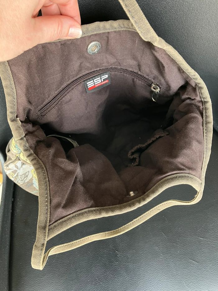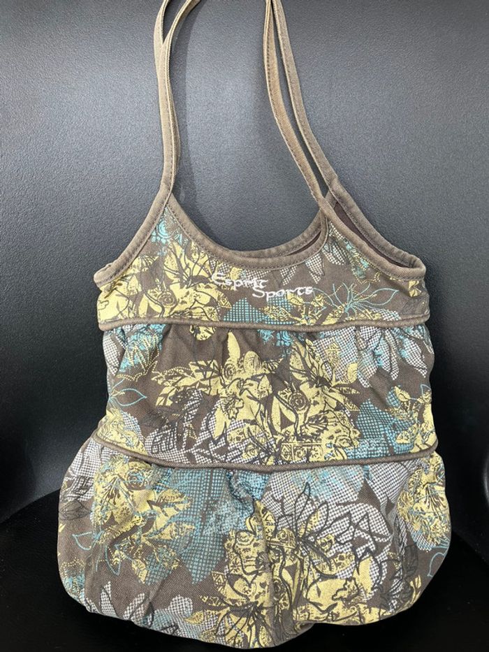 Sac de 54 cm du fond au haut des lanières, de marque esprit sport, avec bouton pression et deux poches à l’intérieur dont une fermée avec une fermeture éclair, 100% coton État correct