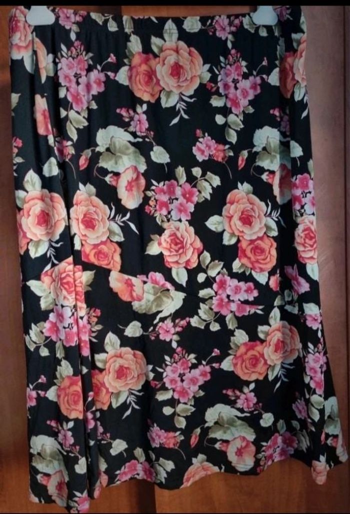 Jupe noir à motif fleurs ,taille 54,jupon intégré, élastique à la taille,longueur 77cm,largeur de la taille 52cm jusqu'à 62cm, largeur 71cm, style fendue sur les côtés.