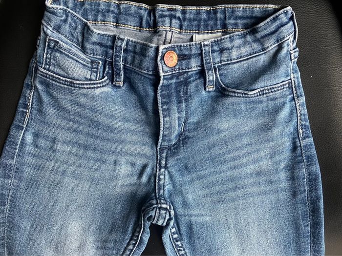 Jean bleu un peu délavé, super skinny fit, taille ajustable avec élastique et boutons, fausses poches devant, deux poches arrière, fermeture éclair et bouton pression, de marque H&M, taille 7-8 ans (128 cm) Très bon état