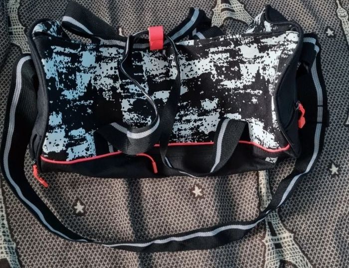 Sac de sport noir et rose fluo à motifs blanc, un grand rangement et 3 pochettes, lanière réglable, longueur 39cm, largeur 21cm,fermeture pressions.