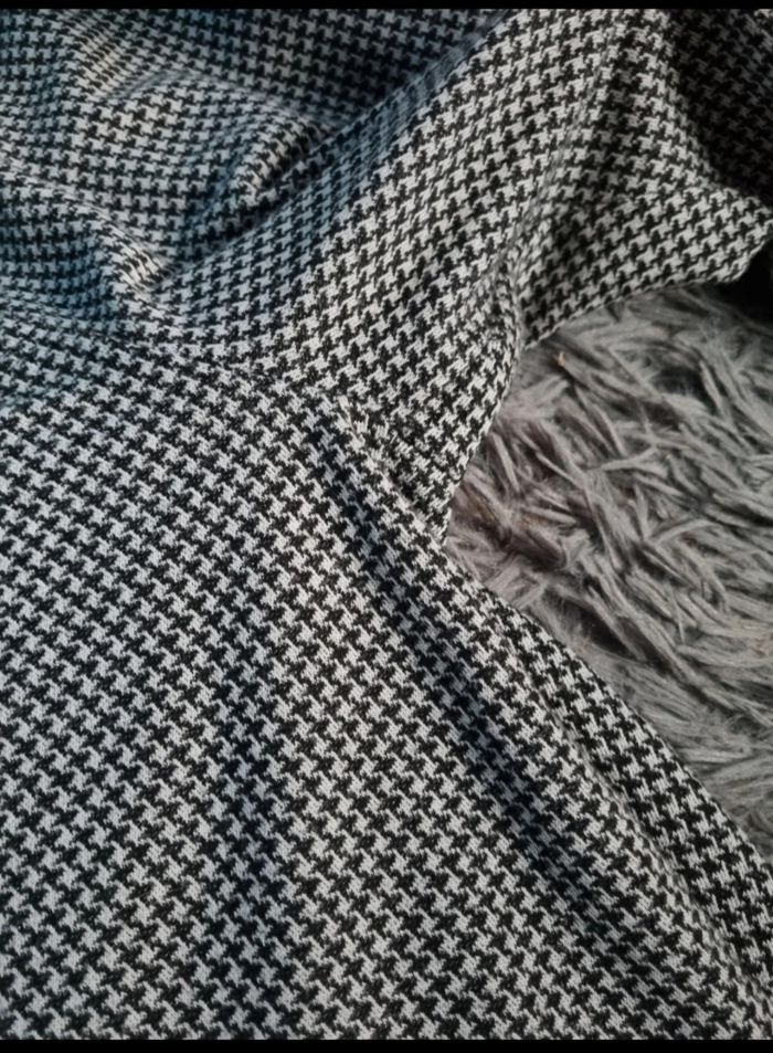 Pantalon à motif pied de poule avec bandes sur les côtés, taille L peut convenir à du Xl marque Jennyfer, longueur 89cm, largeur de la taille 44cm, largeur cuisse 32cm, largeur cheville 18cm.