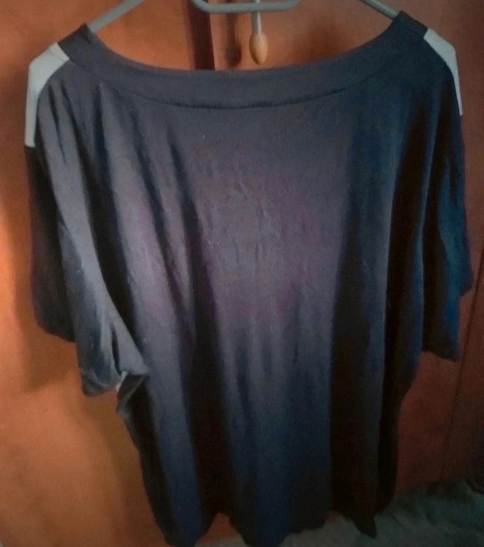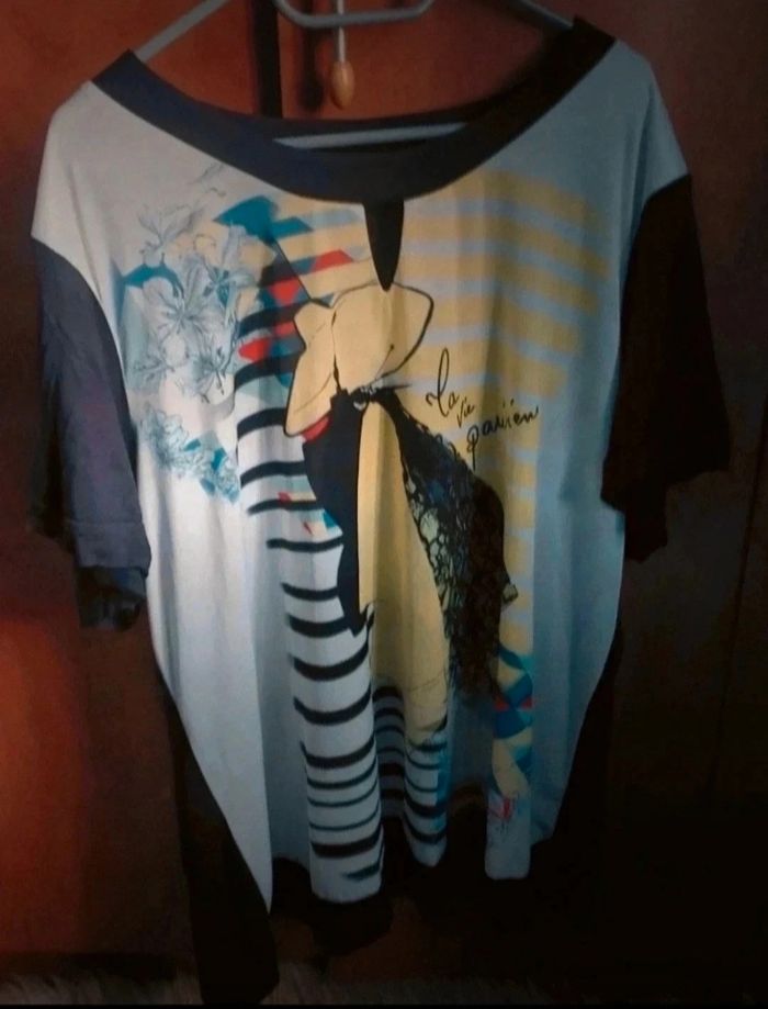 T-shirt femme taille 52 , longueur 80cm, largeur 66cm,longueur épaule à aisselle 28cm, marque Lady belle,taille élastique 52/54,agréable à portée ,mini tache voir dernière photo.