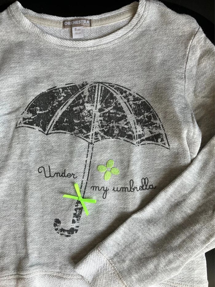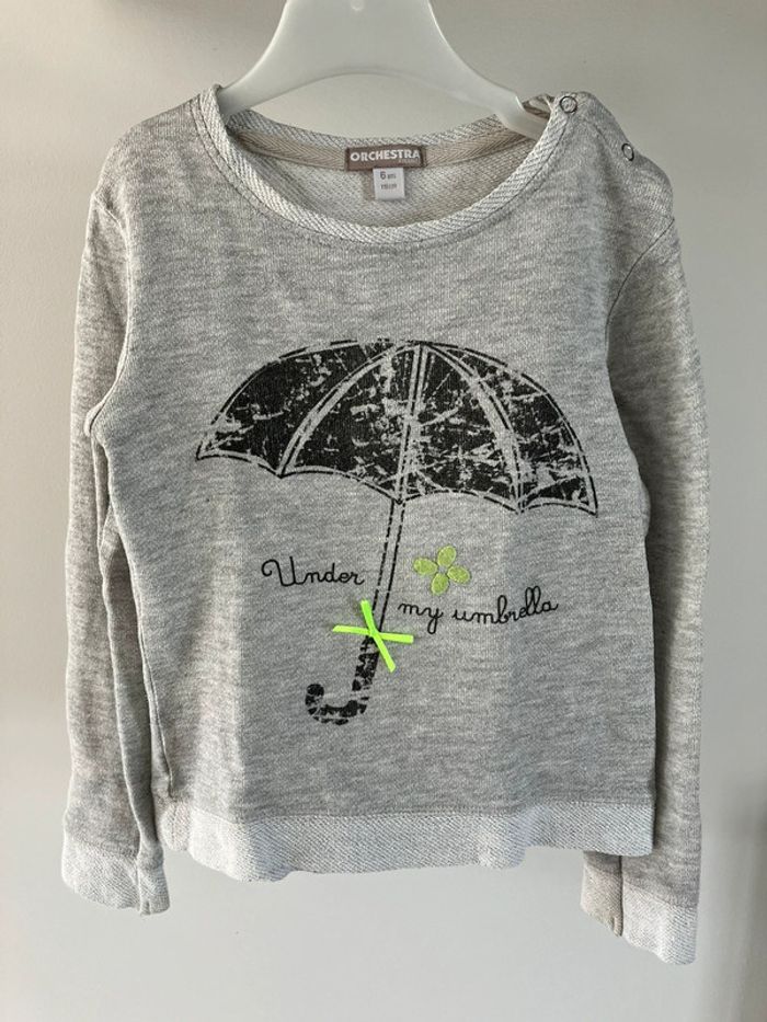 Pull gris un peu cintré, ouverture à l’encolure avec 2 boutons pression, imprimé parapluie, de marque Orchestra, taille 6 ans Très bon état