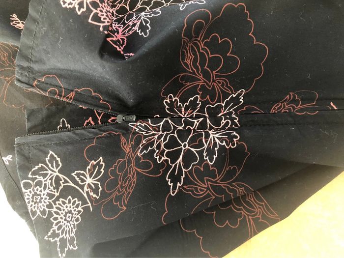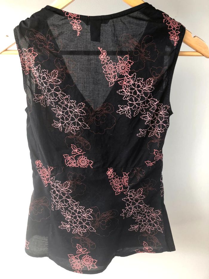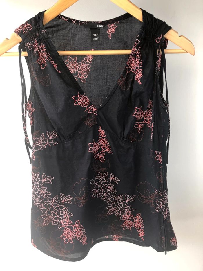 Débardeur noir imprimé floral rose cintré, fronces sous poitrine et sur les épaules avec liens fantaisie, décolleté en V, fermeture éclair sur le coté, de marque H&M, taille 36 Très bon état