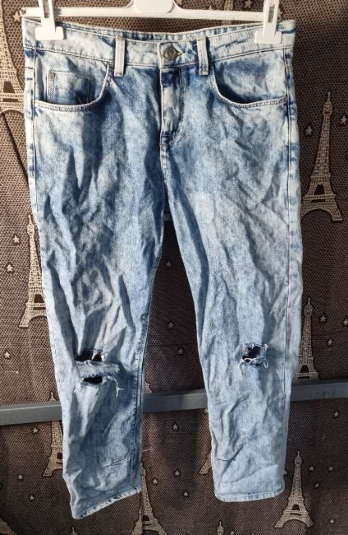 Jeans Boyfriend à trous,taille 38 marque Bershka, longueur 91cm, largeur de la taille 42cm, largeur cuisse 27cm, largeur cheville 16cm,légère tache voir dernière photo.