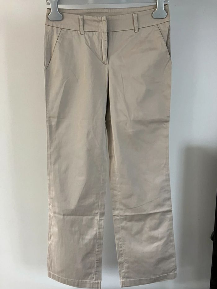 Pantalon beige brillant avec poches devant et derrière, de marque Naf Naf, taille 36, bas réduit à 100 cm du bas à la taille Excellent état