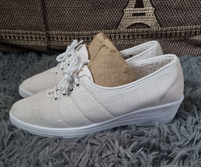 Chaussure compensée couleur crème, pointure 38,avec lacets ,hauteur talons 5cm, semelle intérieure taché mais sinon très bonne état.