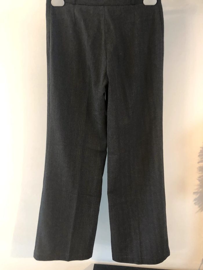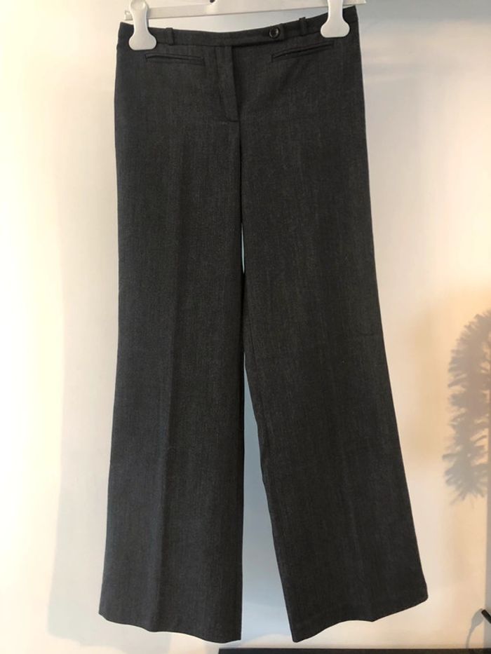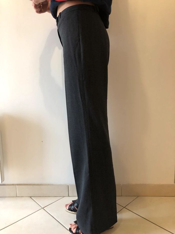 Pantalon droit et large, rayé subtilement gris foncé, boutons et fermeture éclair, deux fausses poches devant, longueur 95 cm, de marque Etam, taille 36 Très bon etat