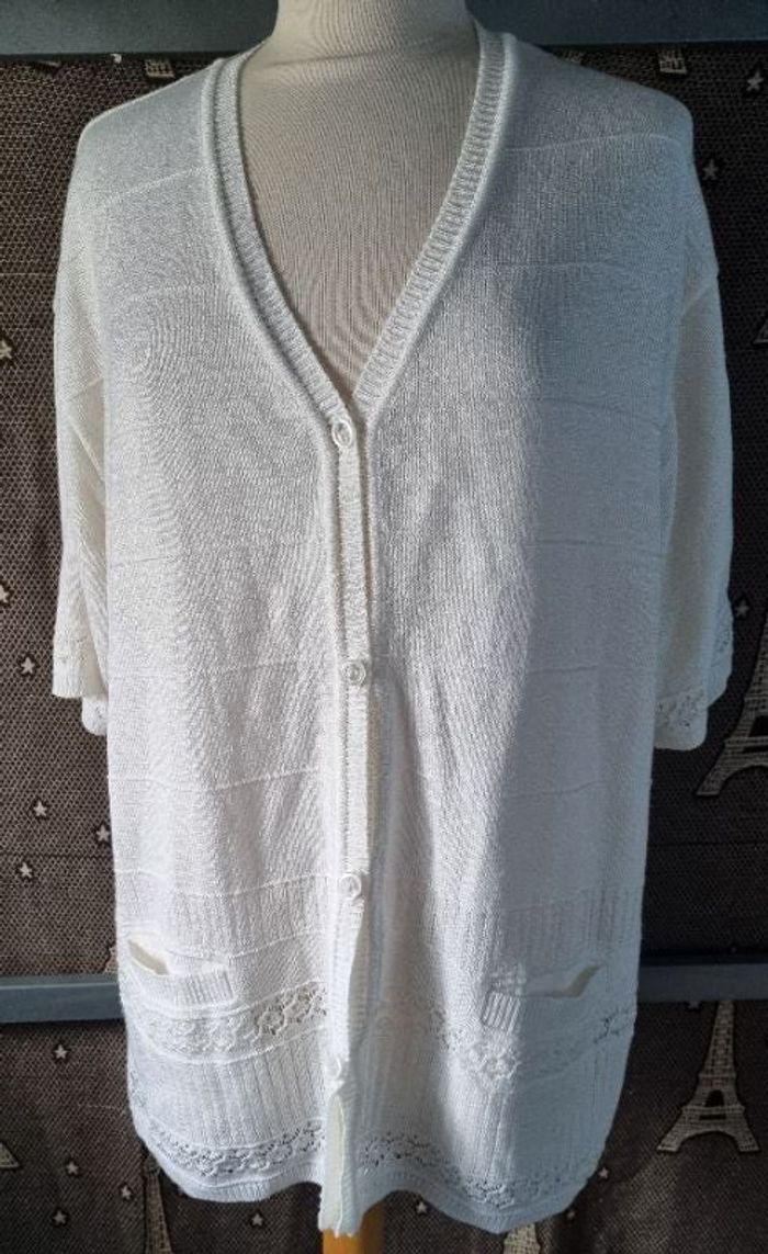 Veste à boutons manches courtes avec broderie, taille 58 marque Afibel, longueur 70cm, largeur 63cm, longueur épaule à aisselle 27cm, largeur aisselle à aisselle 67cm.