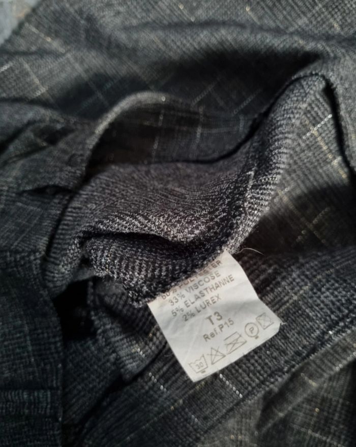 Pantalon gris à carreaux (les contours des carreaux sont pailleté) taille 3,longueur 99cm, largeur de la taille 40cm, largeur cuisse 26cm, largeur cheville 24cm,poches avant et arrière, fermeture zippée avec bouton.