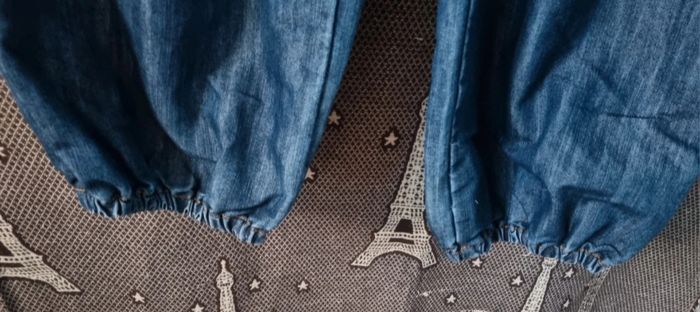 Jean à jambes larges style sarouel taille 38, élastique aux chevilles, longueur 99cm, largeur de la taille 40cm, largeur cuisse 28cm ,largeur cheville 17cm jusqu'à 22cm,fausse poches arrière.