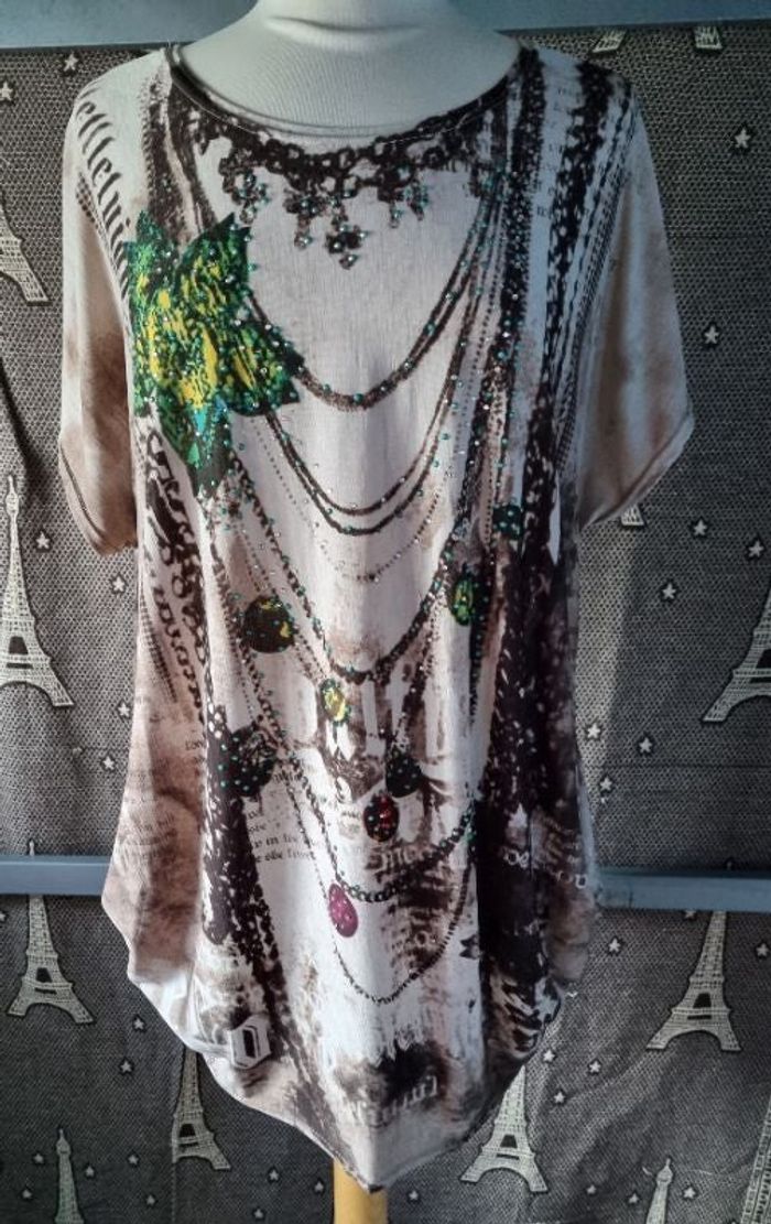 T-shirt imprimé avec strass taille 42-44, longueur 71cm, largeur 51cm, longueur épaule à aisselle 21cm, largeur aisselle à aisselle 62cm,léger acro voir photos.