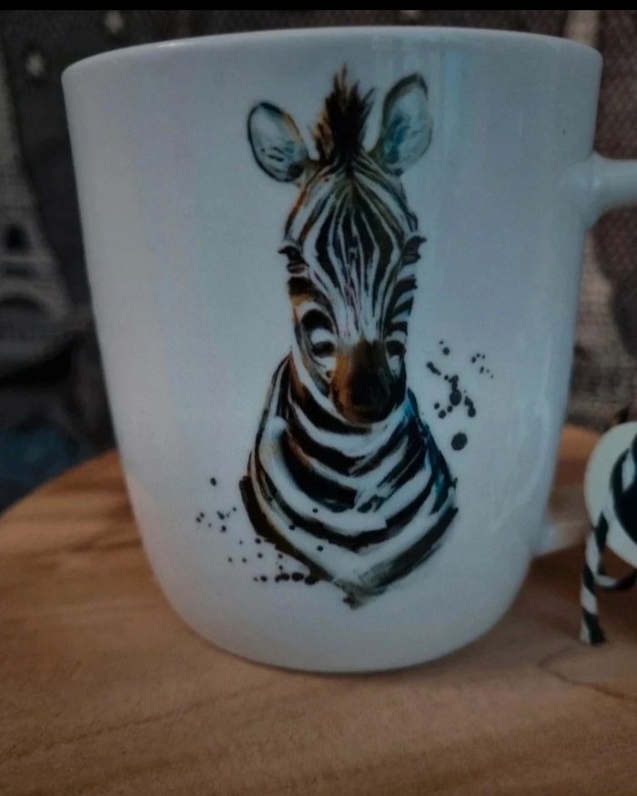 Tasse blanche avec zèbre ,neuf laissée en décoration.
