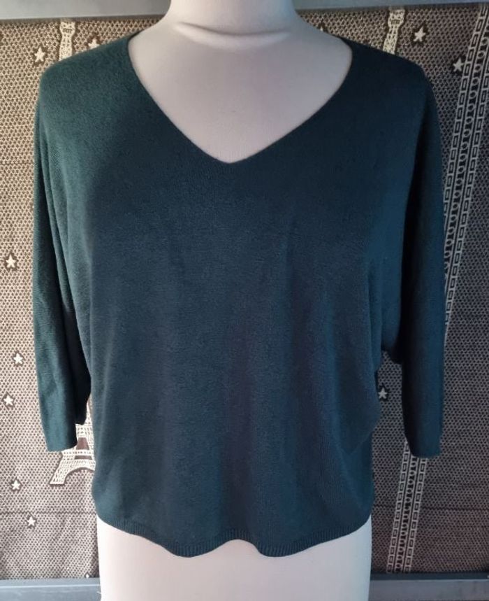 Pull vert taille M,longueur 48cm, largeur 54cm, longueur épaule à aisselle 22cm, largeur aisselle à aisselle 62cm, longueur manche 17cm.