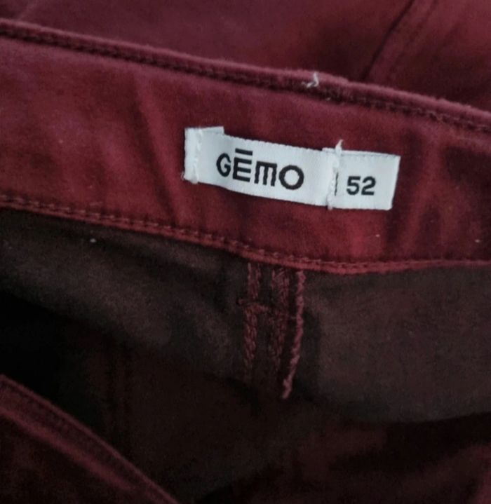 Pantalon couleur prune, taille 52 marque Gémo, fermeture zippée avec bouton, longueur 104cm, largeur de la taille 52cm, largeur cuisse 35cm, largeur cheville 20cm.