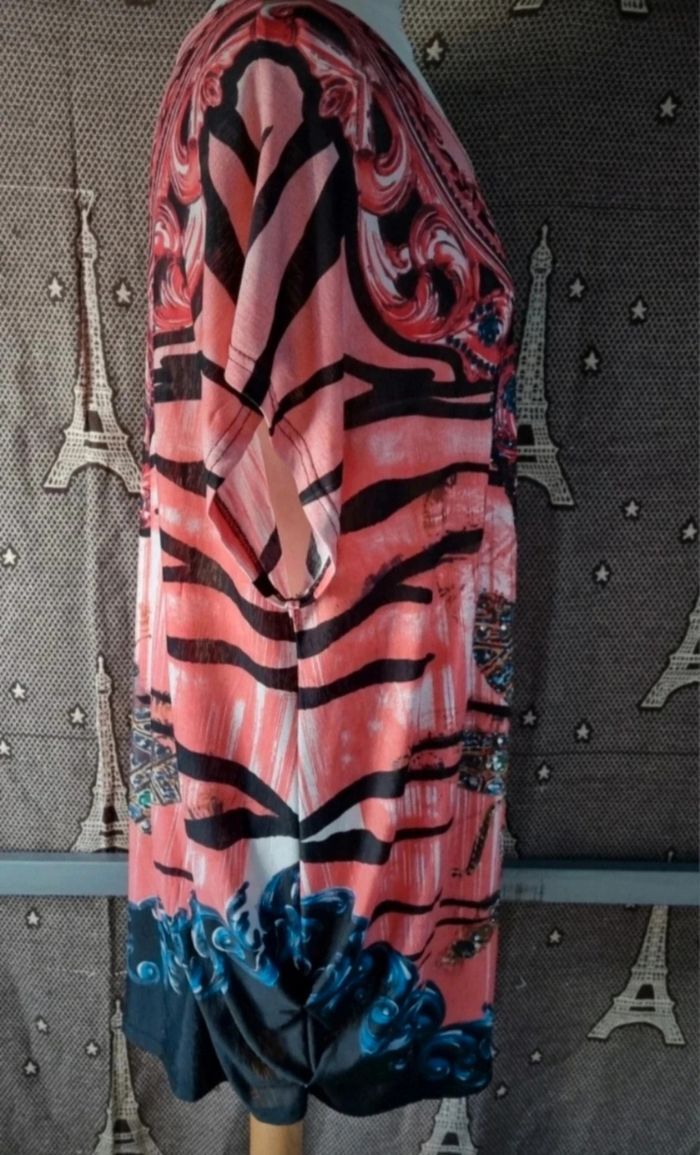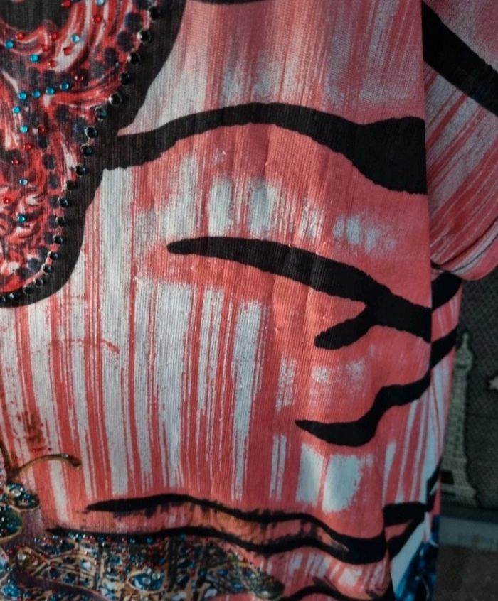 T-shirt léger rose imprimé libellules avec strass taille 44-46, longueur 79cm, largeur 62cm, longueur épaule à aisselle 25cm, largeur aisselle à aisselle 58cm, léger acro voir photos.