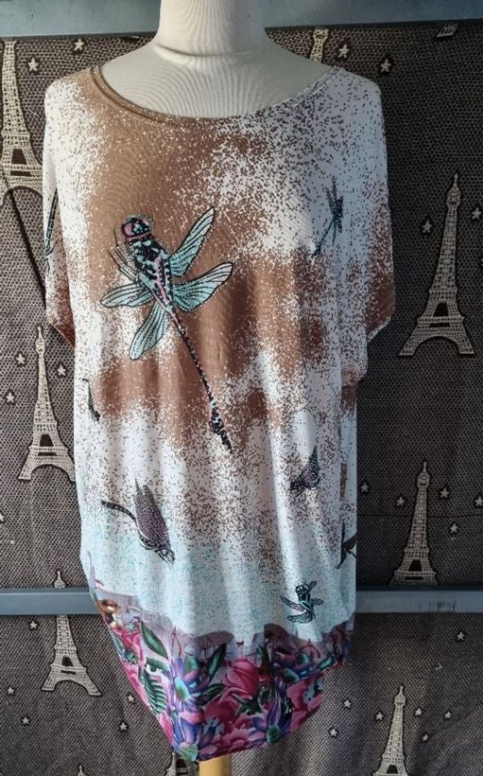 T-shirt léger crème marron imprimé libellules avec strass taille 44-46, longueur 79cm, largeur 58cm, longueur épaule à aisselle 22cm, largeur aisselle à aisselle 64cm,léger acro voir photos.
