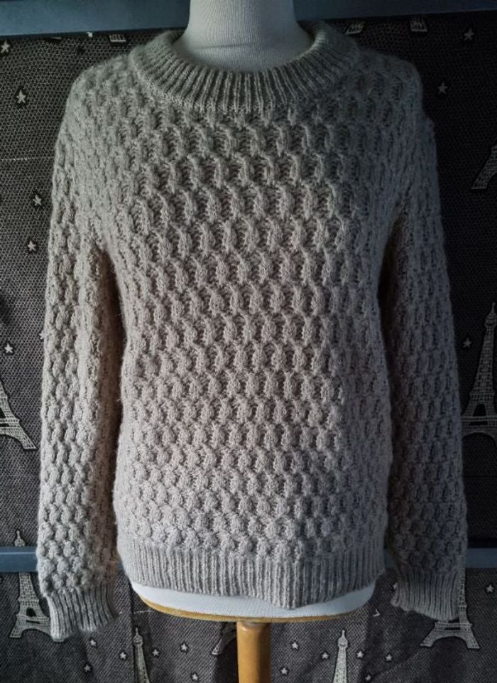 Pull style laine taille 40-42, longueur 61cm, largeur 48cm, longueur épaule à aisselle 20cm, largeur aisselle à aisselle 53cm, longueur manche 48cm,trou voir dernière photo.
