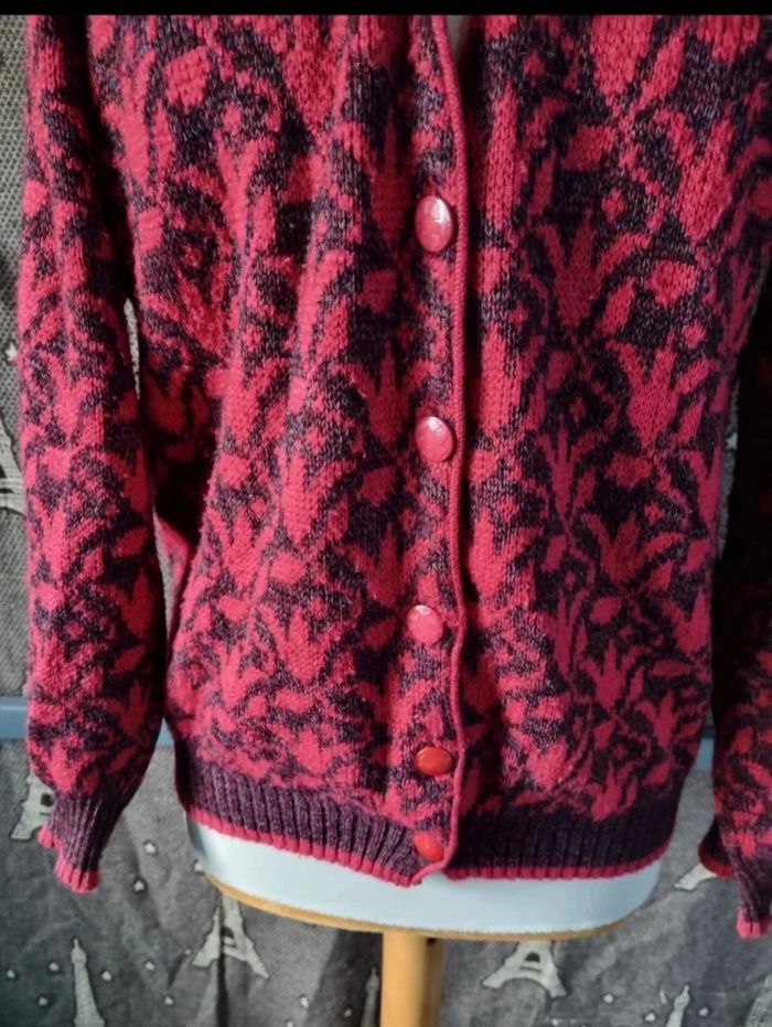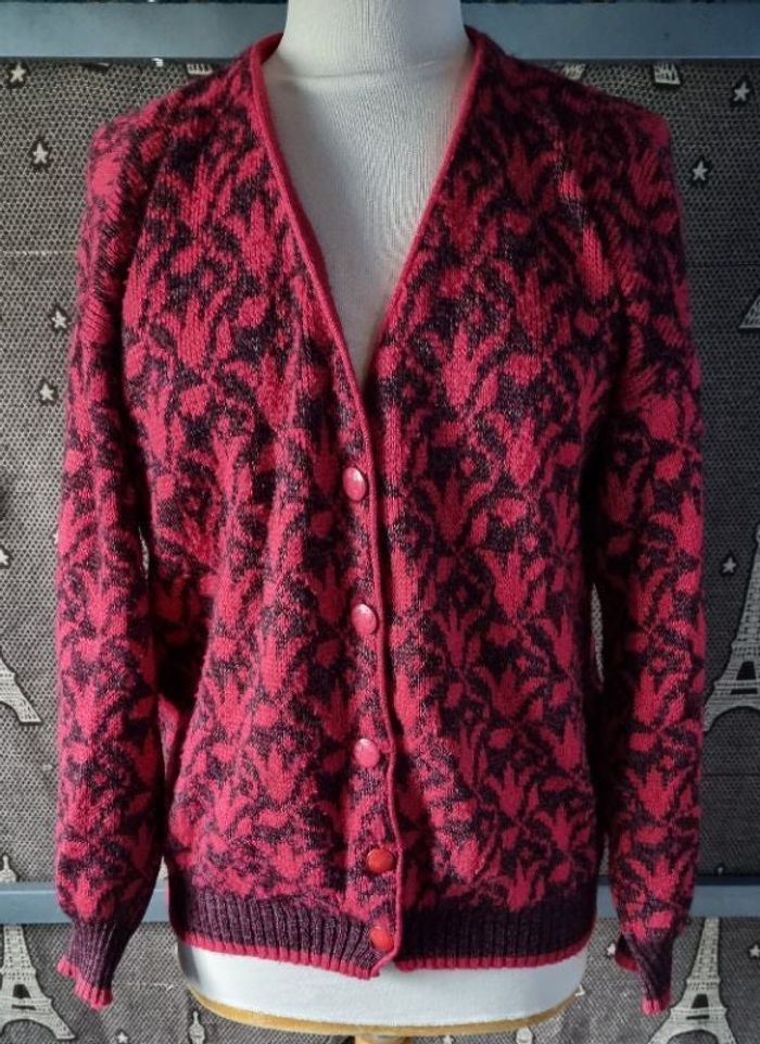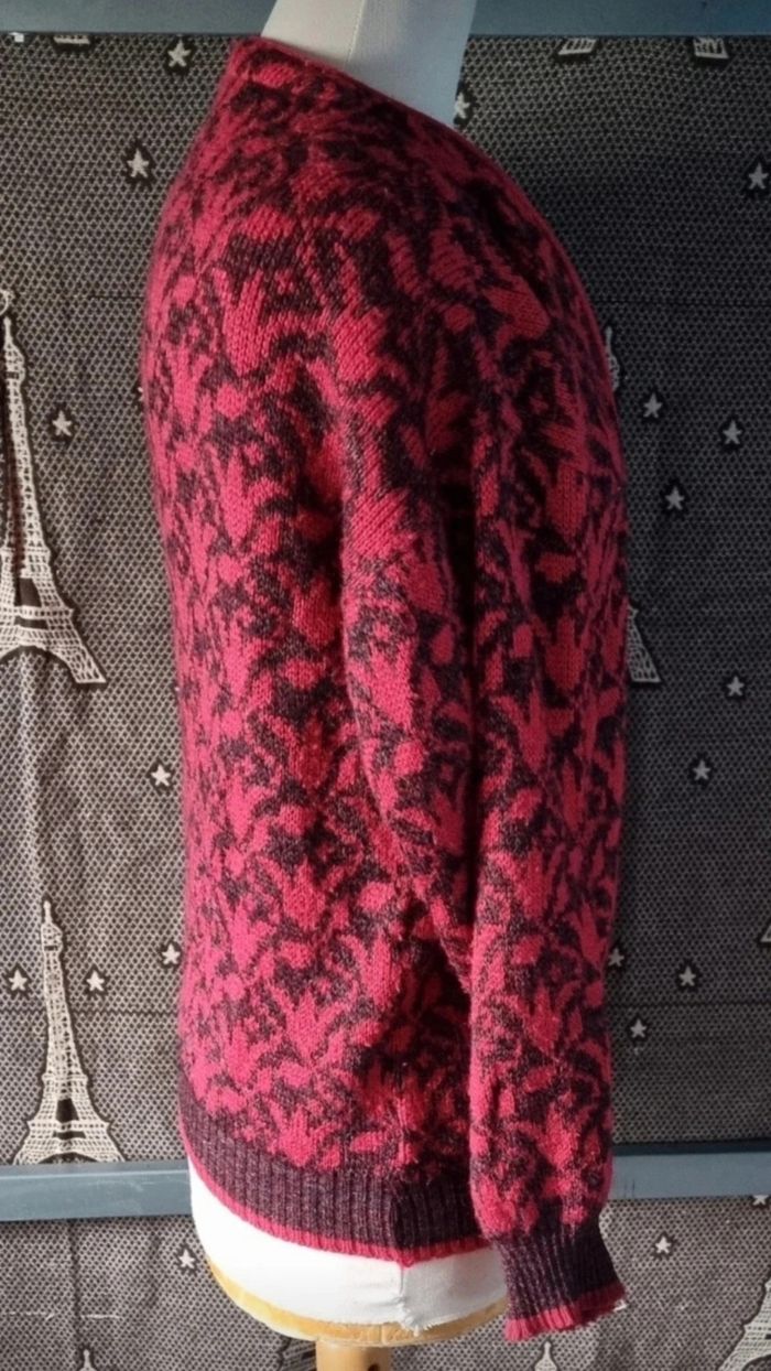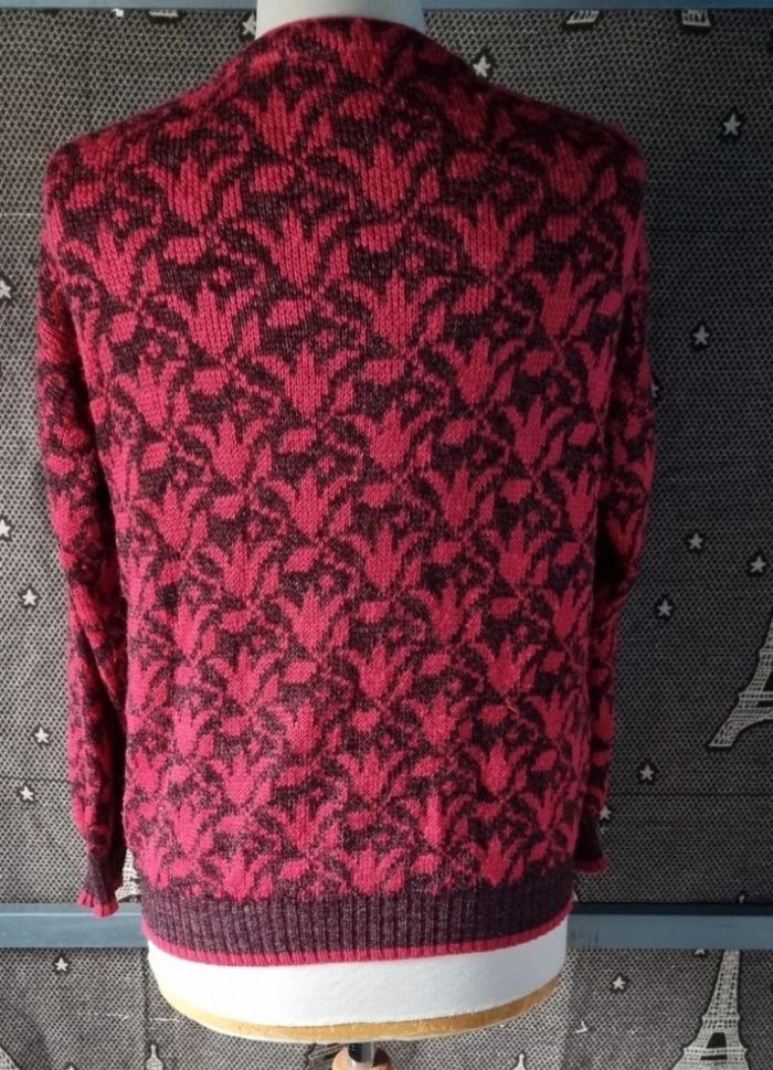 Cardigan à motifs taille 40 ,longueur 60cm, largeur 43cm, longueur épaule à aisselle 20cm, largeur aisselle à aisselle 52cm,longueur manche 47cm.