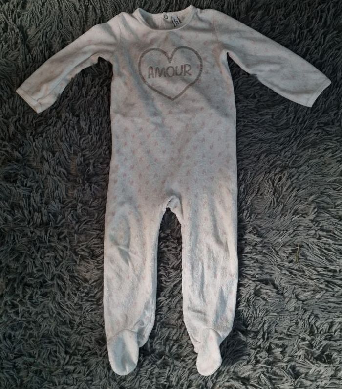 Grenouillère blanche à motifs cœurs avec écriture, taille 24mois marque Fashion Private Company, léger défaut voir dernière photo.