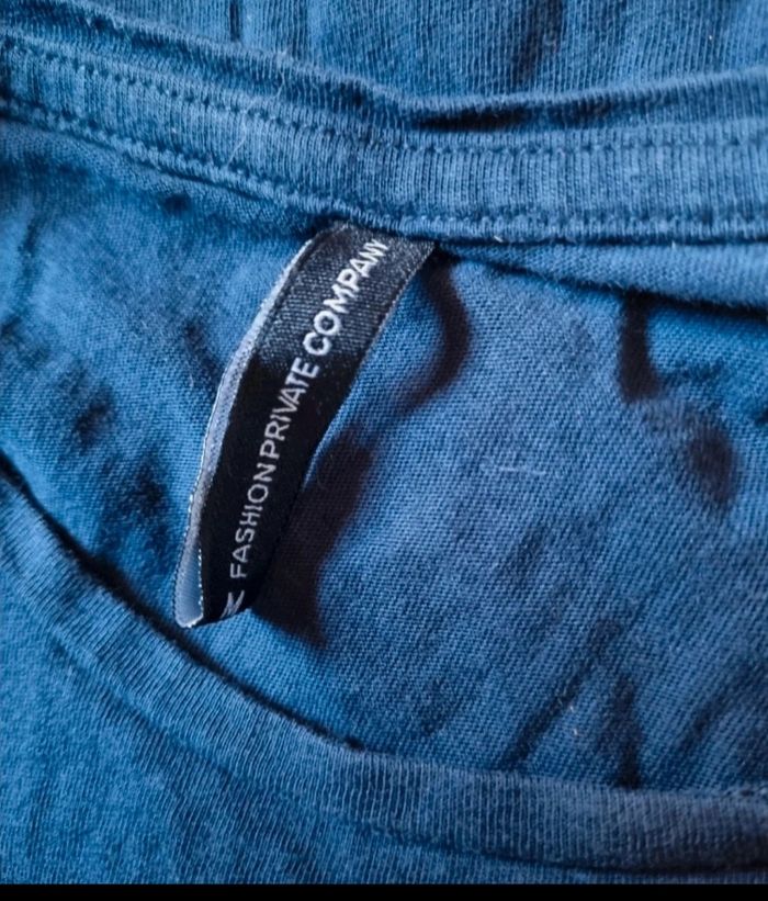 T-shirt marine avec écriture humour, taille M marque Fashion Private Company, longueur 60cm, largeur 44cm, longueur épaule à aisselle 20cm, largeur aisselle à aisselle 48cm.